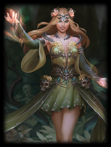 | Persephone places a Skull (max 6/6/8/8/10) and can activate it with a Basic Attack to heal herself. She stores up to 6 Skulls. After 2.5s it turns into a Sprout that explodes when activated, damaging and slowing enemies. After 16s it turns into a Flower that chases down enemies when activated for 2.2s before biting them. After activation or 120s it withers. Enemies recently hit by Harvest take reduced damage from additional hits stacking 3 times. | Notes: | ||